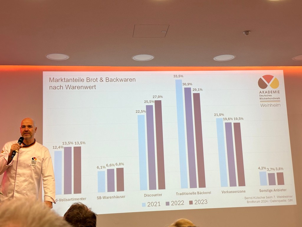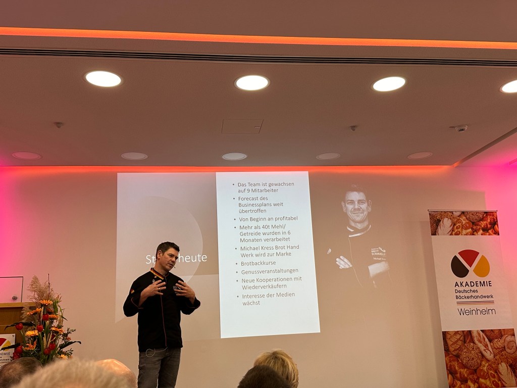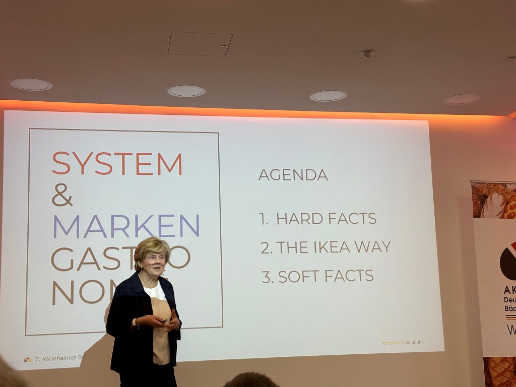 Bis auf den letzten Stuhl besetzt war der größte Seminarraum der Bundesakademie des Bäckerhandwerks beim 7. Weinheimer Brotforum. 170 Teilnehmer aus Deutschland, Österreich, der Schweiz und Belgien, darunter viele der erfolgreichsten Unternehmer der Branche, erfuhren zunächst allerneuste Zahlen zum Brotmarkt. Direktor Bernd Kütscher brachte dazu weitere Marktentwicklungen wie z.B. die Chancen von künstlicher Intelligenz (KI) ein. Anschließend schilderte mein Brot-Sommelier-Kollege Michael Kress sehr offen das Scheitern seiner Familienbäckerei an einem Generationenkonflikt. Auch beim Neustart mit einer sehr erfolgreichen Brot-Manufaktur in Weinheim nahm er die Gäste mit. Es folgte Annette Mützel, die seit vielen Jahren als Beraterin in der Gastrobranche unterwegs ist und dabei u.a. die IKEA Restaurants nebst Hot Dog Stationen aufgebaut hatte. Sie erläuterte, was Bäckereien von großen Marken der Systemgastronomie lernen können.