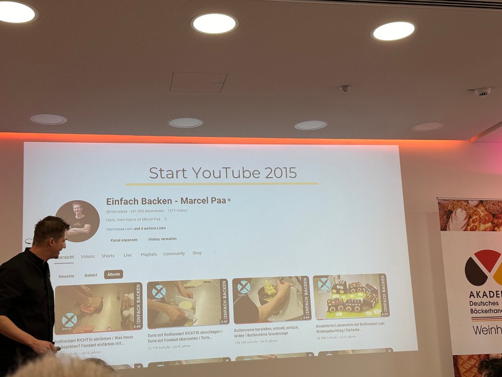 Im zweiten Block zeigte Marcel Paa aus der Schweiz, wie er mit YouTube Videos und Begleitaktivitäten ein Unternehmen mit 7 Mitarbeiter betreibt. Ich habe ihn beim Frühstück kennengelernt und über uns Brot-Sommeliers geplaudert. Bei seinem Vortrag stellte er sich dabei selbst humorvoll als „Vorgruppe“ vor, denn nach seien Ausführungen betrat die bekannte YouTuberin Sally die Bühne. Sie hatte vor 10 Jahren als Grundschullehrerin das Backen eines Nusszopfes gepostet und begeistert heute 2 Millionen Follower bei YouTube sowie 1 Millionen Follower bei Instagram. Im lockeren Talk mit Moderator Prof. Michael Kleinert erläuterte Sally sympathisch wie authentisch ihre Motivation und gab Einblicke in ihre Unternehmung, die über 100 Mitarbeiter beschäftigt. Alleine ihr Online-Shop bietet über 2.000 Produkte an, dazu ist sie Markenbotschafterin großer Brands.