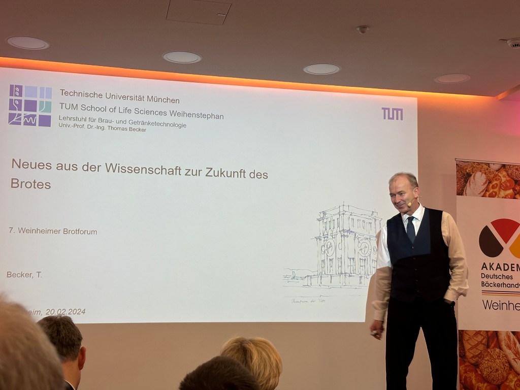 Nach einer weiteren Kommunikationspause, in der die Bäcker unter den Referenten wieder ihre besten Brote zur Degustation aufgeschnitten haben, übernahmen zunächst namhafte Wissenschaftler die Bühne. Prof. Dr. Thomas Becker von der TU München, nebenbei auch Vorsitzender des wissenschaftlichen Beirats von Akademie und Brotinstitut, begeisterte mit neusten Erkenntnissen seines Lehrstuhls. Ein weiteres Beiratsmitglied, Prof. Dr. Friedrich Longin von der Universität Hohenheim, ergänzte diese um den Aspekt des Klimawandels: „Der Kunde bezahlt mit dem Brotpreis ja nicht nur den Bäcker, sondern auch den Saatzüchter, den Landhandel, den Landwirt, den Getreidehandel, den Müller und den Großhandel wie z.B. die BÄKOs. Um die Herausforderungen des Klimawandels auf die Getreidequalitäten zu bewältigen, müssen alle in dieser Wertschöpfungskette enger zusammenrücken.“