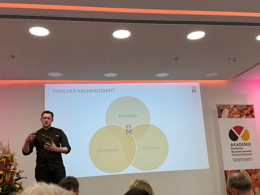 Den krönenden Abschluss des 7. Weinheimer Brotforums bildete Christian Scherpel von der vielfach ausgezeichneten Bäckerei Malzers Backstube aus Gelsenkirchen. Diese gab tiefe Einblicke in deren Bemühungen um mehr Nachhaltigkeit. Dabei teilte er mit den Gästen sogar einen umfangreichen Nachhaltigkeitsbericht, der für größere Bäckereien in Zukunft verpflichtend wird.